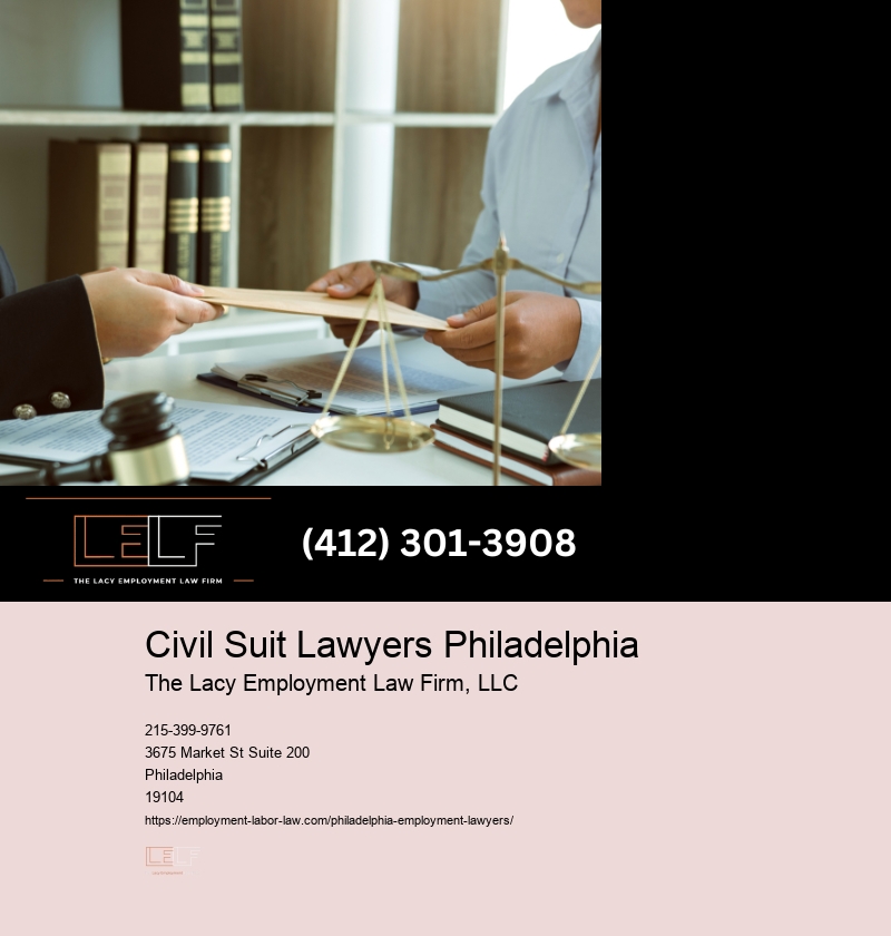 Our firm's approach is both strategic and empathetic, understanding that each case carries its unique challenges and impacts. Learn more about Civil Suit Lawyers Philadelphia here The team at Lacy Employment Law Firm LLC delves deep into each case, gathering evidence that supports claims of wrongful termination. Learn more about The Lacy Employment Law Firm here. The Lacy Employment Law Firm LLC equips workers in Philadelphia with the knowledge and strategies needed to navigate these complex situations. They break down the legal process into understandable steps, ensuring clients grasp their rights and the paths available to them.