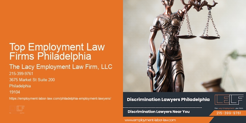Navigating wage disputes requires a firm grasp of employment law and a strategic approach to resolution. Philadelphia employment discrimination lawyer Through their tireless advocacy, they're not just defending individual clients; they're championing a cause that benefits the entire workforce. Learn more about Top Employment Law Firms Philadelphia here Expanding their legal expertise, Lacy Employment Law Firm LLC now adeptly handles cases of wrongful termination, championing the rights of those unjustly dismissed from their jobs. Learn more about The Lacy Employment Law Firm LLC here. Philadelphia employment law blog To connect with the foremost expert employment lawyers in Philadelphia, refer to the contact information provided below.